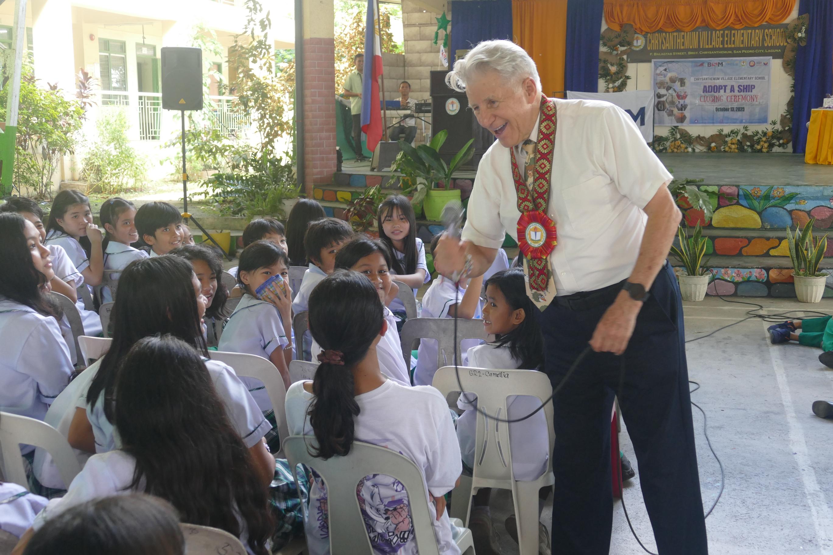 Mr. George Hoyt, IMO Goodwill Maritime Ambassador, conveyed his appreciation to the principal and to BSM for their unwavering support. He highlighted the importance of teamwork, sharing that his own friendships have lasted for 70 years because of respect and love. He also stressed the vital role of the shipping industry in sustaining the daily needs of people around the world, noting that without seafarers, half of the world could suffer and operations could freeze. One of the highlights of his message was his hope that the partnership—with BSM and OSM—continues to help students dream big.