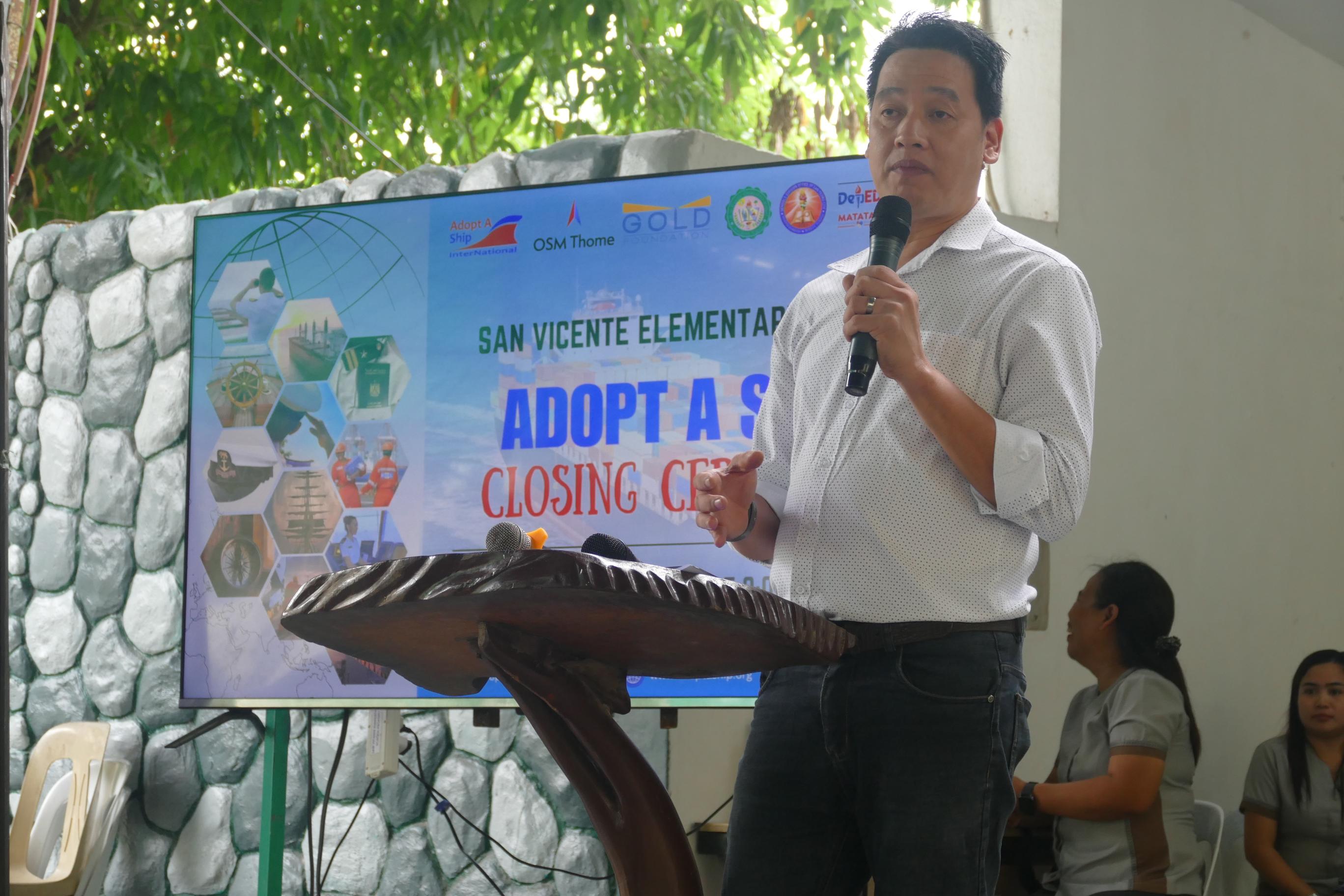 The ceremony opened with a warm welcome from Mr. Erwin S. Corpuz, School Head, who engaged the learners by asking about their experiences with the Adopt a Ship Program. He expressed heartfelt gratitude to OSM Thome and AASI, describing the event not merely as a ceremony but as a successful journey and celebration of partnership.